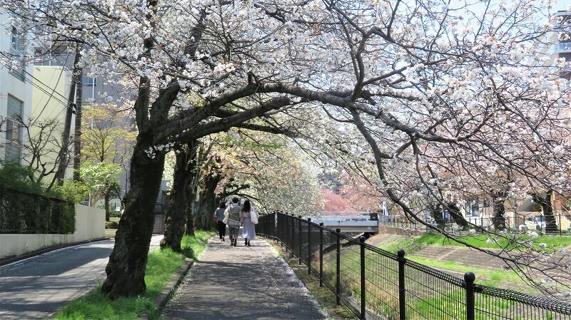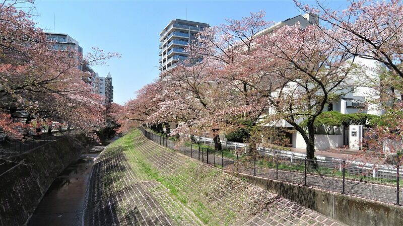 多摩ニュータウン通りに沿って流れる乞田川の両側に