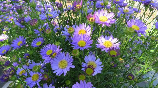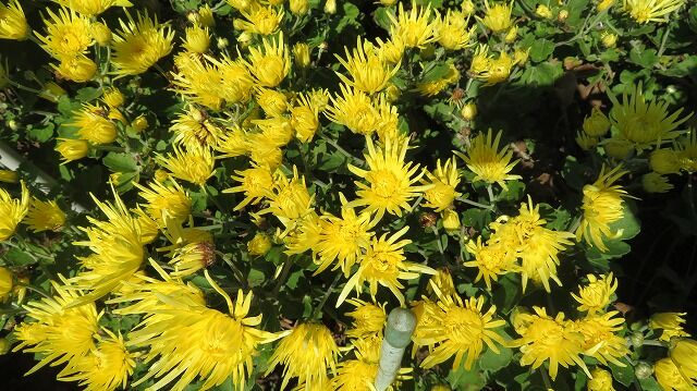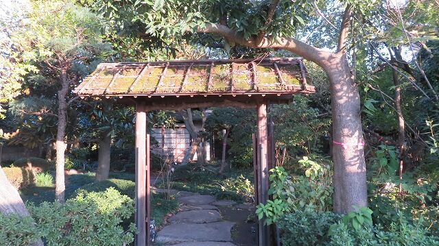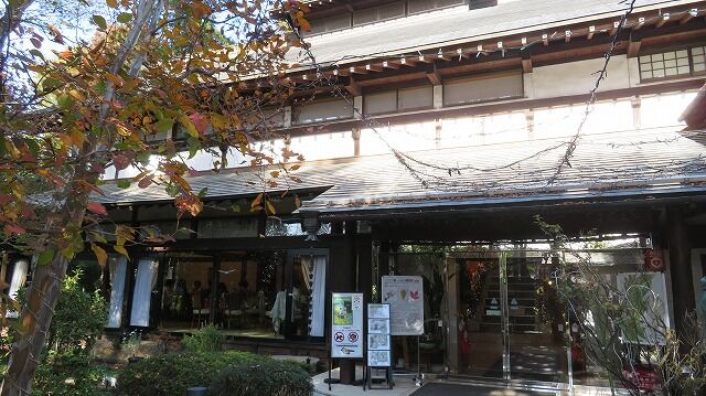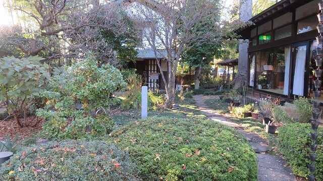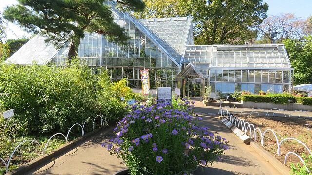 薬用植物園ヤマジノギクサキシマフヨウツワブキリヨウリギクアワコガネギク林の中へ温室へモンテンボクサンゴバナシャカトウ