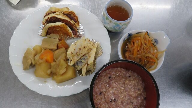 11月穀菜食大豆タンパクの葛かけどら焼き肉じゃが蓮根のマスタードあえ玄米がゆから玄米甘酒