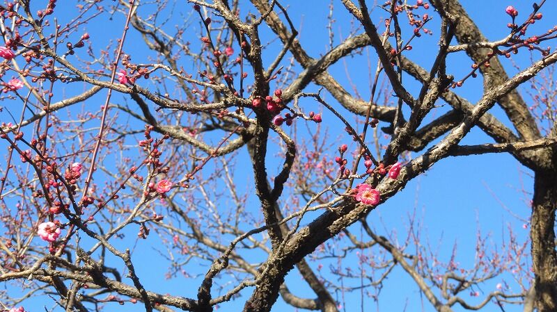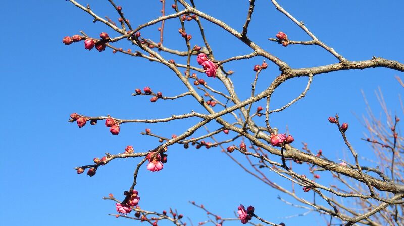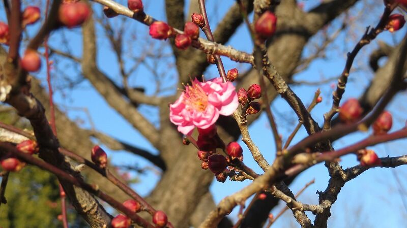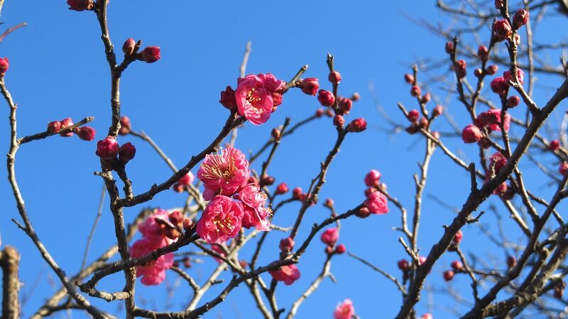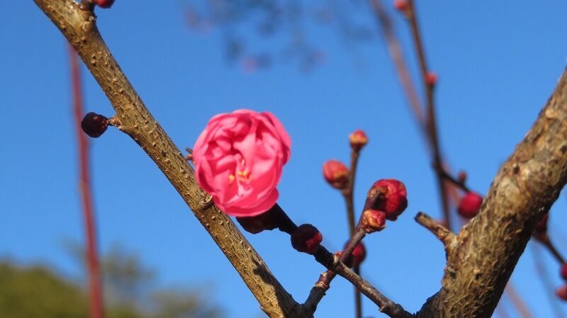 早咲きの八重寒紅、青空に映えて