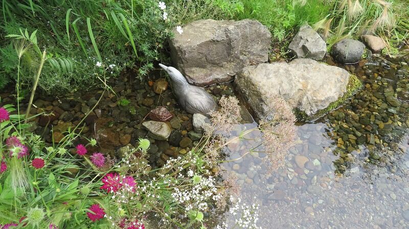 小川がさらさら流れるのを眺めているとカモのオブジェを発見。