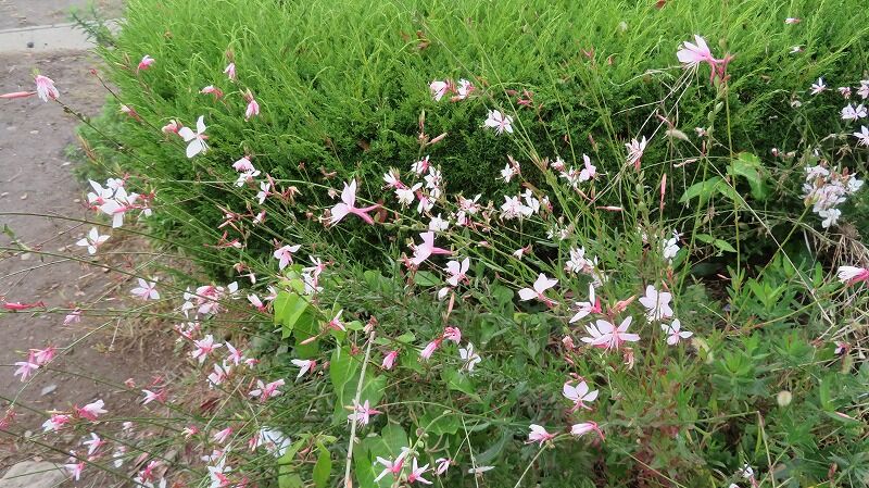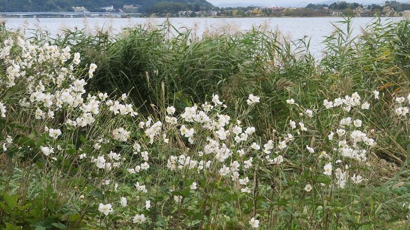湖畔の遊歩道に沿って様々な花々が咲き誇っています。